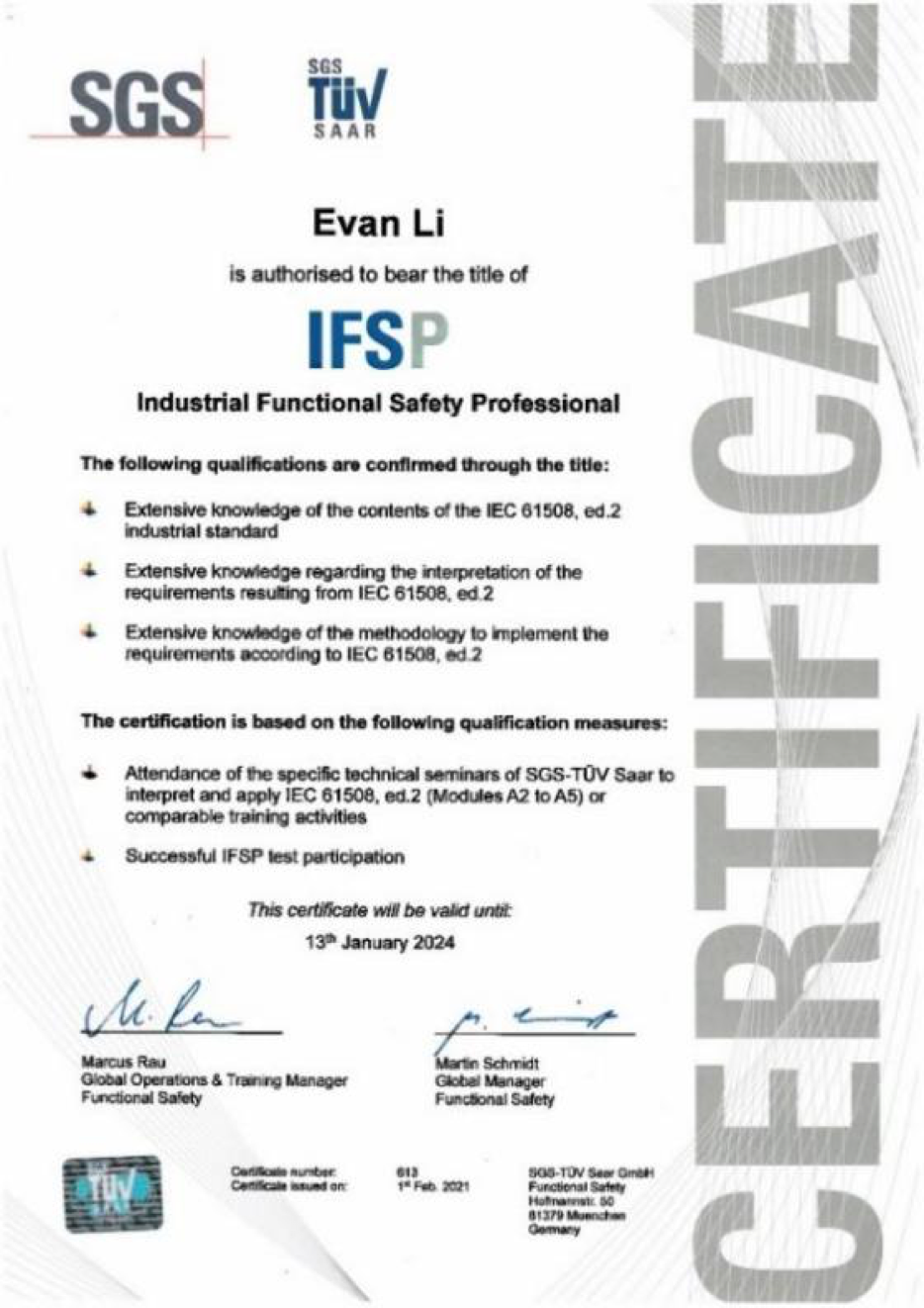 • 顺利完成课程及考试后,可获得国家机器人检测与评定中心(总部)签发的IFSP功能安全证书和SGS-TüV Saar签发的IFSP功能安全证书。